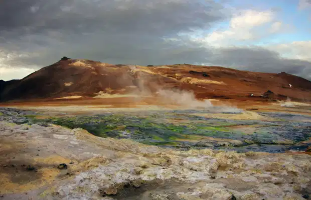 Maloliente, árida, desértica pero con un atractivo innegable, Hverir con sus charcas de barro ardiente, fumarolas, pozos de perforación y una inagotable cantidad de depósitos de azufre más parece la pesadilla daliniana de un pintor que hubiese mezclado todos los colores en su paleta que lo que podríamos llamar un paisaje al uso.